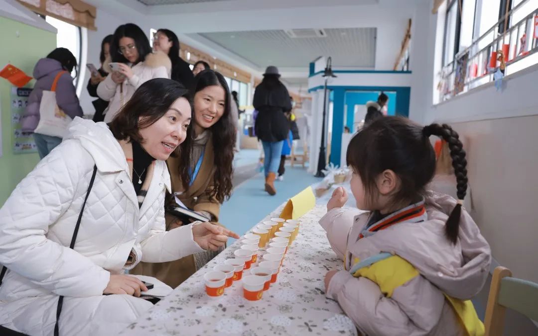 讲座学习后,与会老师走进我园“冬日社区里的小美好”主题下的幼儿游戏现场,游览禾园“冬日里的社区”角色游戏长廊,走进幼儿主导的社区生活游戏场,赏冬景,品热茶,织毛衣,趣购物,共劳动,长经验,感受幼儿承担职业劳动的热情与专注。走进班级,和幼儿一起体会冬日时令特点,玩赏冬日趣味,看幼儿与树枝、石头、棉花游戏,在与幼儿的亲切互动中感受自主、愉悦的游戏氛围。