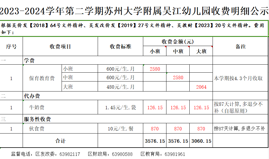 根据吴价发〔2018〕64号、吴发改价发〔2019〕27号、吴教财〔2023〕20号文件精神,苏州大学附属吴江幼儿园对照文件标准,严格执行。本学期我园各年龄段收费明细如下: