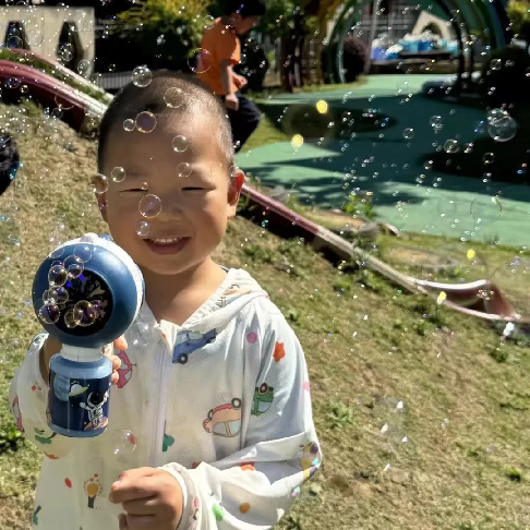 鼓着小脸,吹啊吹啊,绚丽的泡泡,随着激动的心,变大、变大,飞啊、飞啊,“砰”!在风里,是童年的声音。在纸上,是童年的色彩。