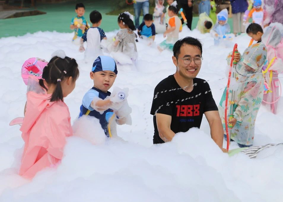 操场上,一场超嗨的“水花狂欢节”拉开序幕。水枪大战、欢乐泼洒、软软泡沫……家长和孩子们一起游戏,在亲子体验中感受幼儿园精彩活动的快乐。
