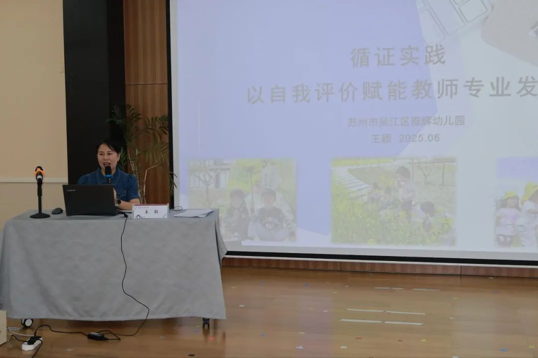 精彩的教学活动展示落下帷幕后,王颖园长以《循证实践 以自我评价赋能教师专业发展》为题进行专题讲座。王园长从循证实践的概念剖析出发为我们揭示了一条教育决策的科学路径,是涵括计划、实施、观察、评价、改进五步的动态循环,也是实现科学自我评价的重要方式,王园长以“初步感知自评,建立自评信心”、“依托园本教研,建立自评工具”、“进行循证实践,动态优化完善”三部曲为我们讲解了具体的操作办法。一个小时的讲座干货满满,引人深思,也为本次活动画上了完美的句号。