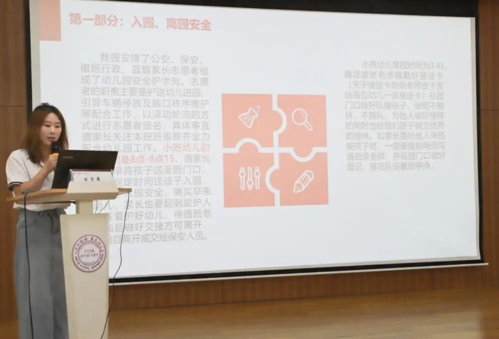 安全,是一切生长的基石。总务与安全处吴小莲主任就我园安全工作、卫生保健、膳食管理等方面内容进行了全方面的介绍与讲解。同时,对幼儿的晨午检以及需要家长配合的各方面内容进行了细致的说明,希望家园携手,让孩子们有一个健康、安全的生活环境,健康快乐的成长。