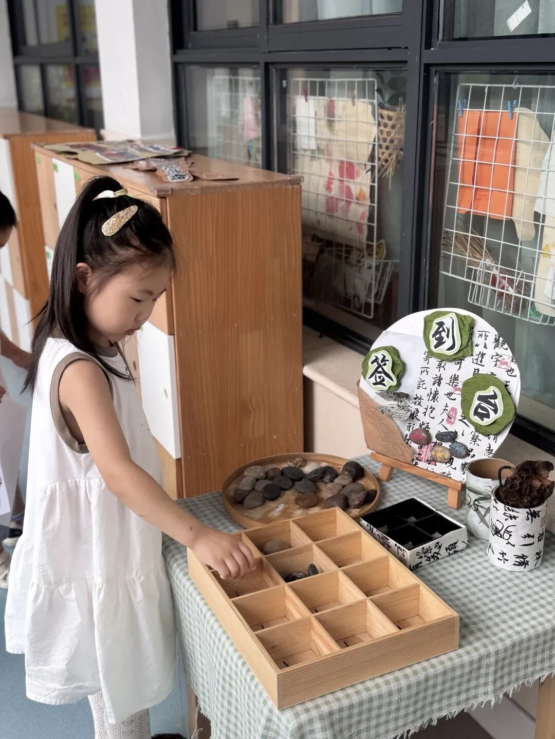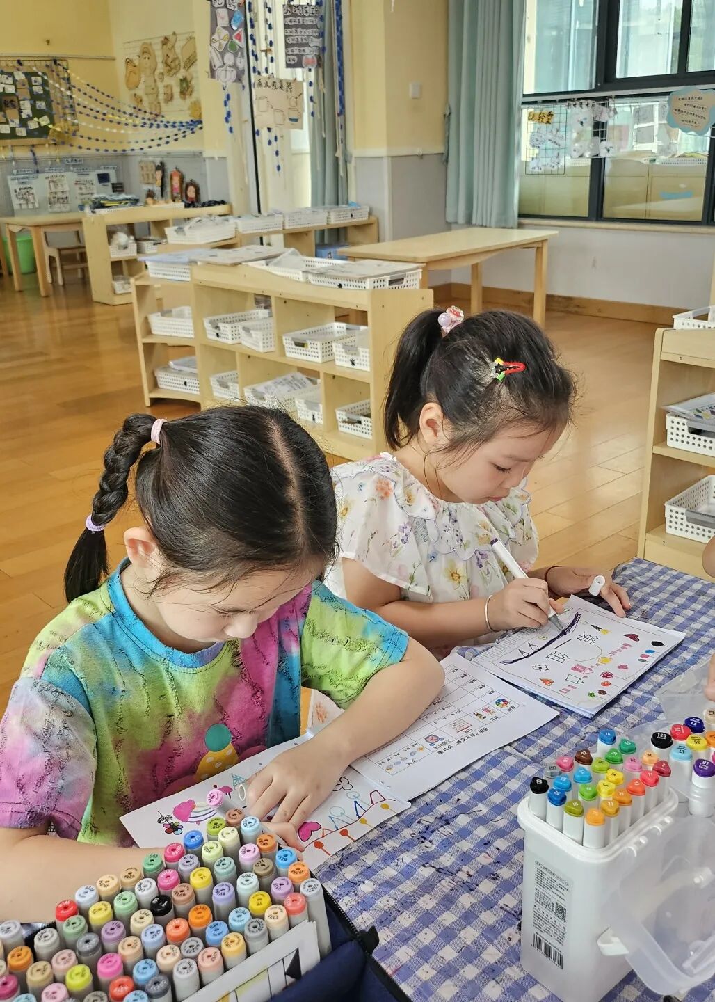 大班的孩子们动手能力更加厉害了,他们挥舞手中彩色的画笔,自己制作出了好看的签到表。
