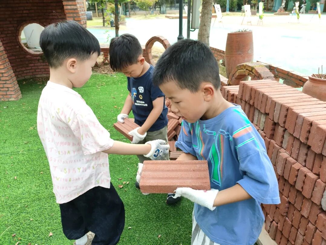 他们也更加喜欢与同伴们进行合作,他们一起搬运砖块,一起规划设计,在红砖建构区留下了精彩的作品。