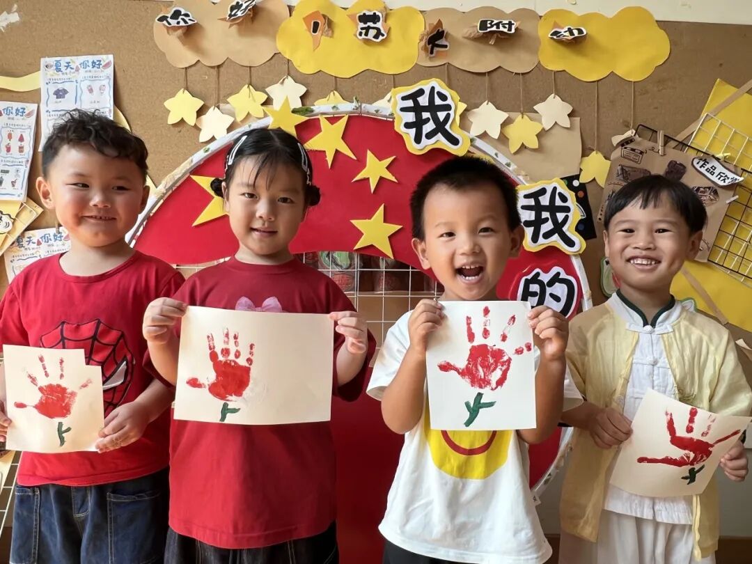 瞧,小一班的宝贝们伸出小小手,印出了一面面鲜艳的五星红旗,共同祝愿祖国妈妈生日快乐!