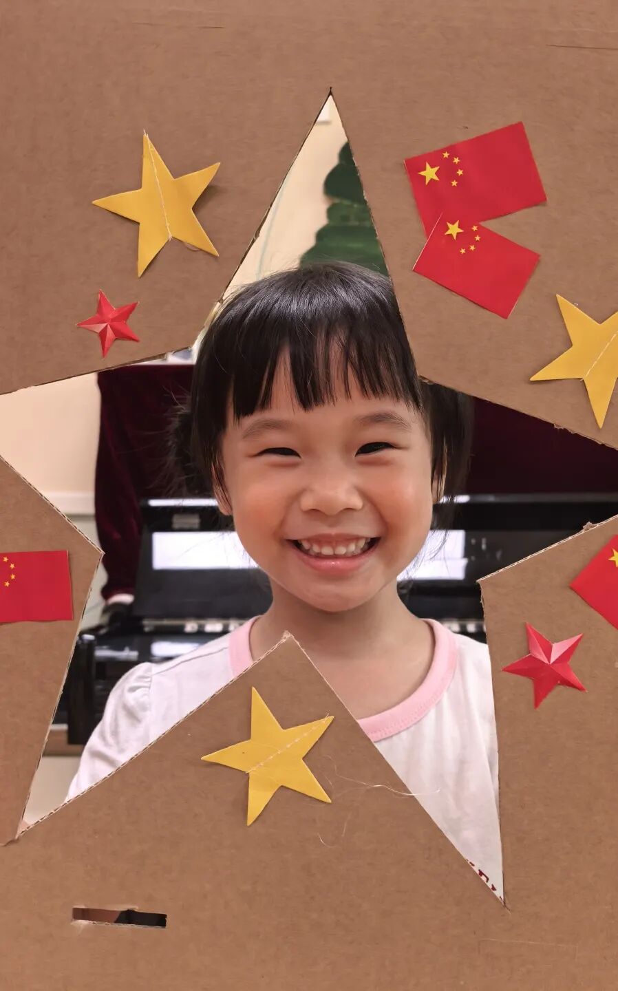 相框印上鲜艳的国旗图案和闪耀的五角星,相机定格下小二班孩子们的笑颜,满满的童真与温情,祖国妈妈生日快乐!