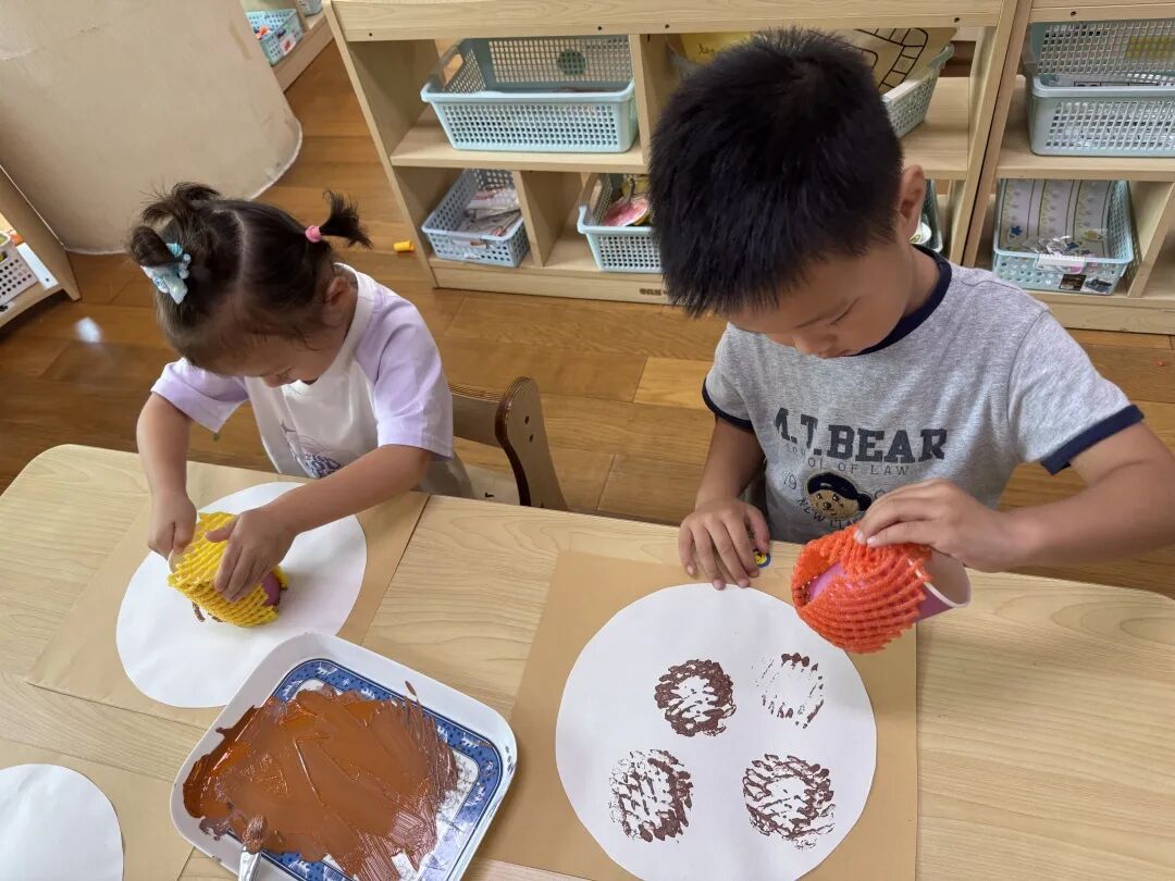 水果网和小罐子能做什么?在小三班宝宝们的手中,它们变成了神奇的拓印工具,压出了一枚枚有着独特纹样的“月饼”。