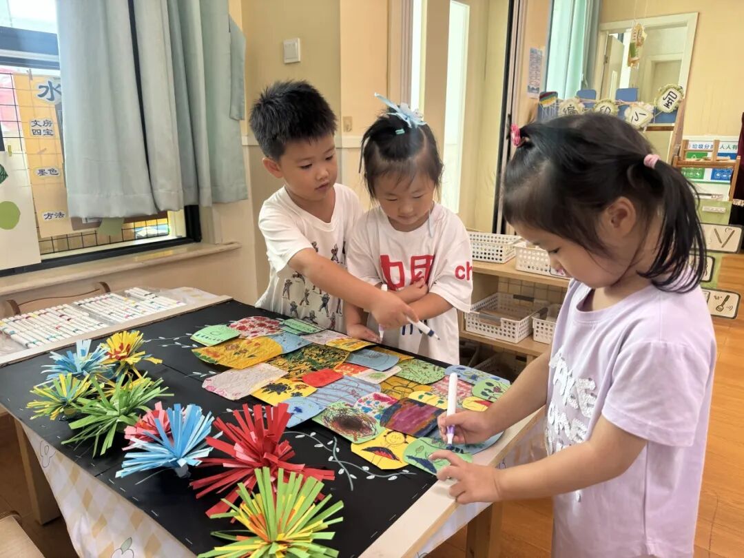 小二班的孩子们化身小小设计师,用树叶、滚轮等工具,在团扇上拓印出五彩斑斓的花纹,把传统变成节日的艺术礼物。