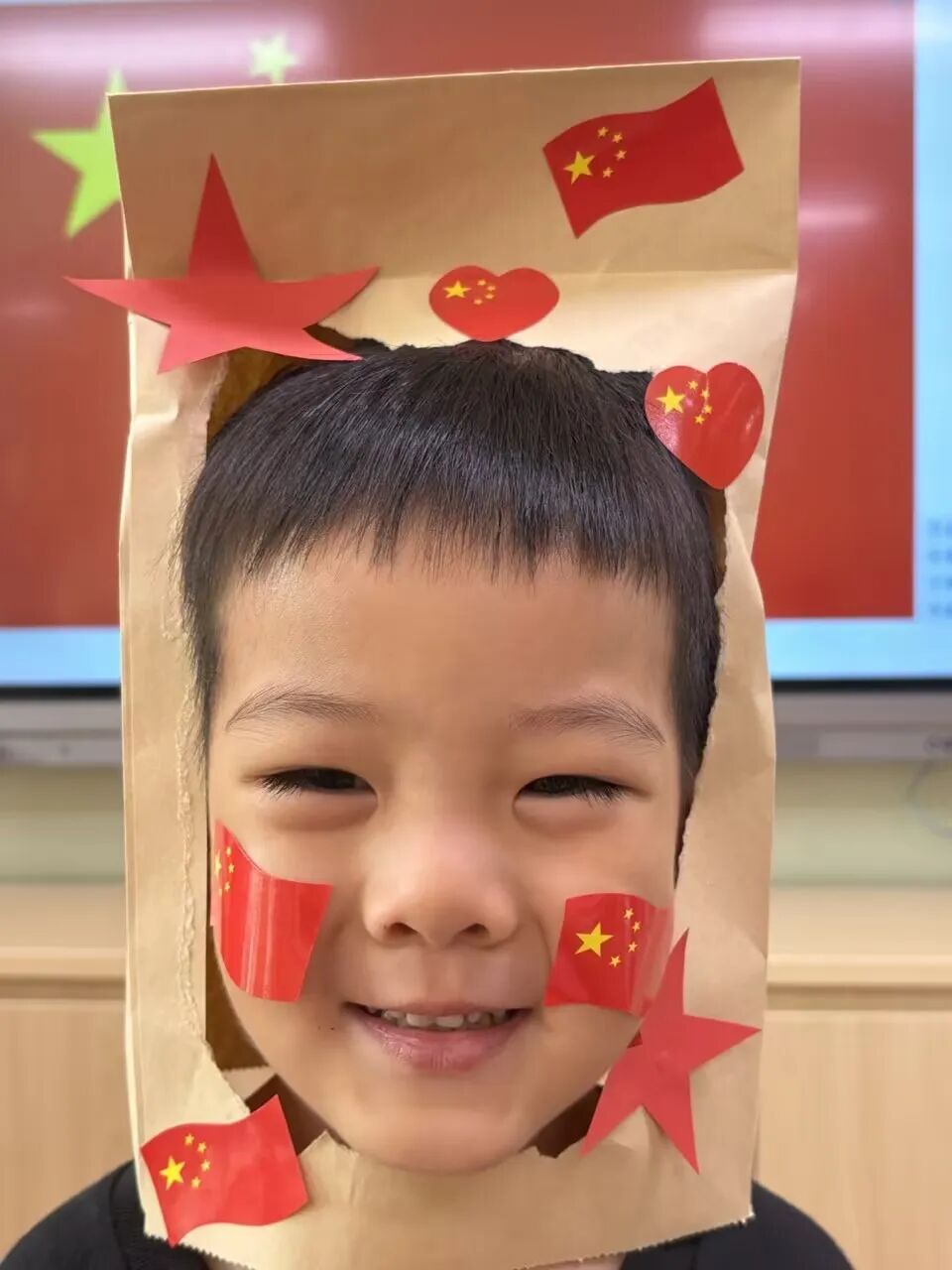 在小三班,平凡的纸袋被巧手变成荣耀的“勋章”,孩子们戴上这份独特的骄傲,相机定格下他们萌化人心的爱国情怀。