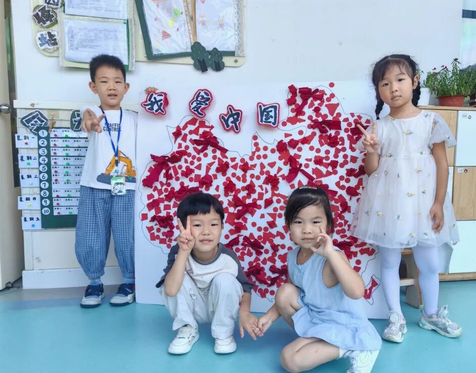 中二班的小小拼贴艺术家们,将红色的纸片与蝴蝶结,细心贴成中国地图的图案,把对祖国的爱,拼进心里的版图。