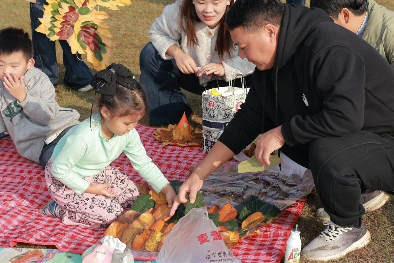 孩子们与家长一同收集落叶,银杏、梧桐……各式叶子成了创作素材。回到制作区,旧T恤变身披风,卡纸制成头冠,落叶在巧手中化为一件件独特作品。